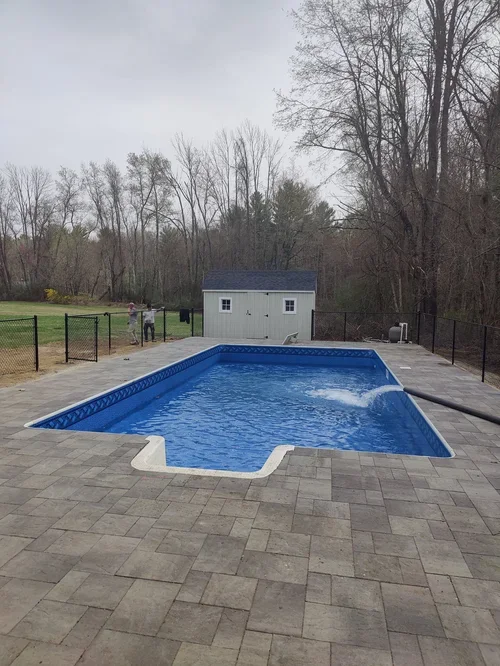 These pools are already assembled and ready to be shipped. Ground is excavated and the plumbing lines and equipment will be installed once the swimming pool is lowered into the ground. Add pavers around the pool to complete a beautiful patio.